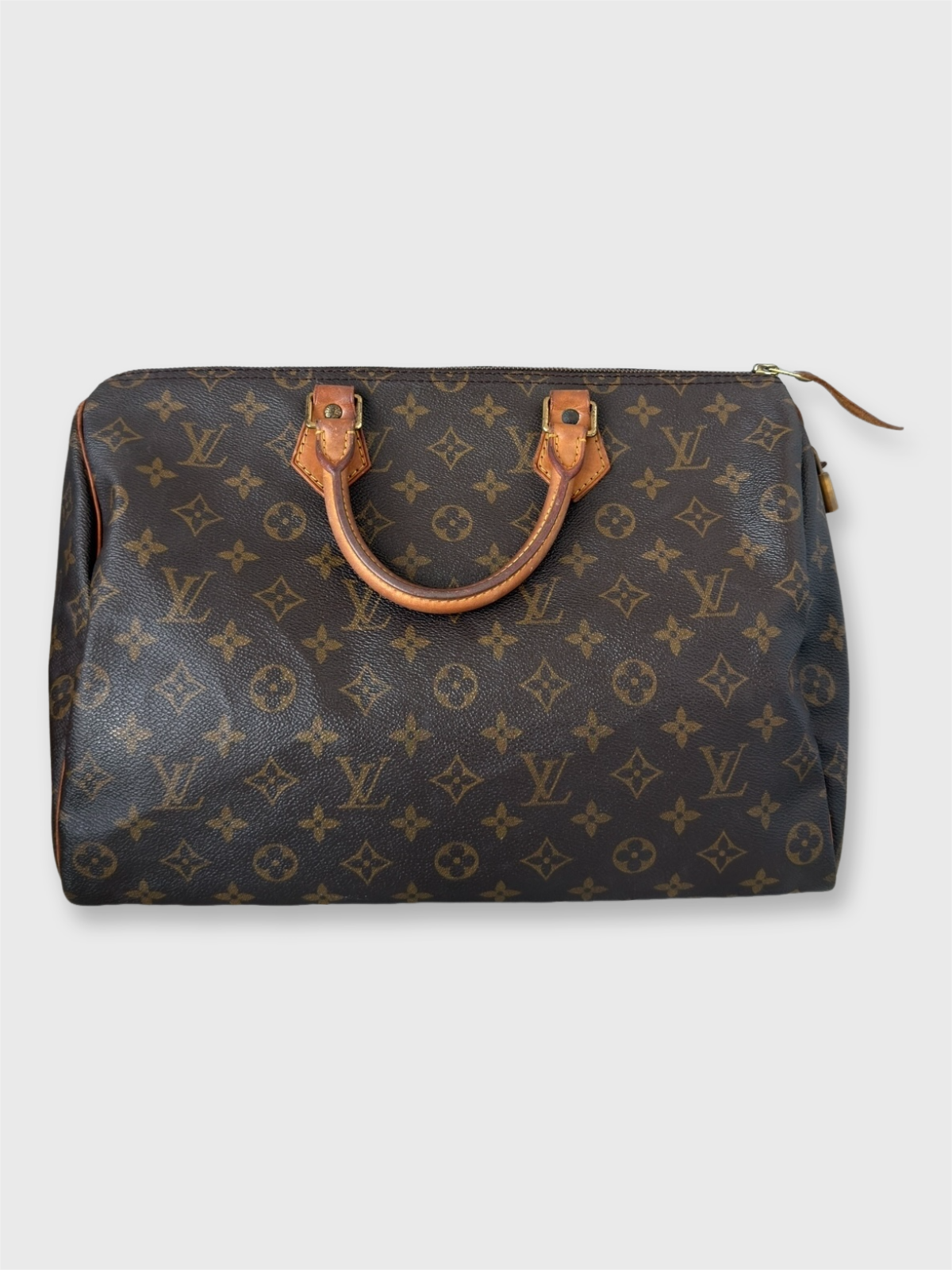 Bolso de mano vintage de la firma francesa Louis Vuitton. El exterior se encuentra confeccionado en lona monogram LV, acabados de piel y piezas metálicas refinadas. El interior se encuentra confeccionado en forro de tela. Su diseño incluye cierre de cremallera y un compartimento interior.