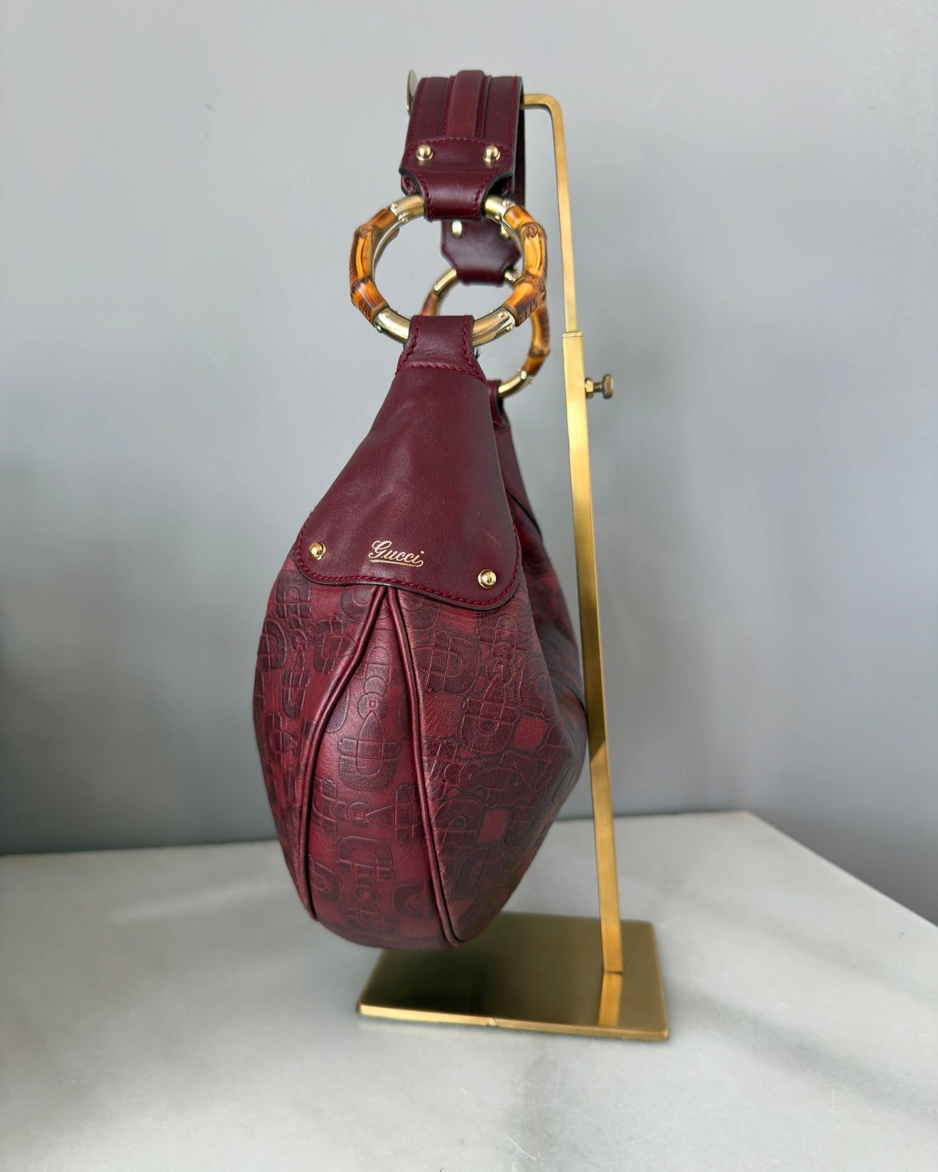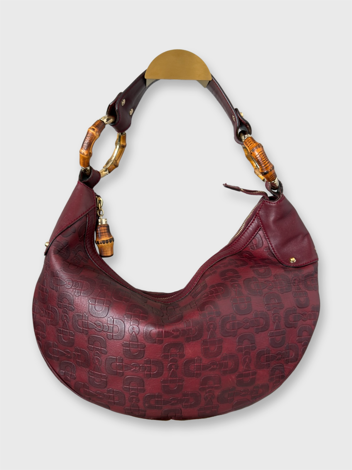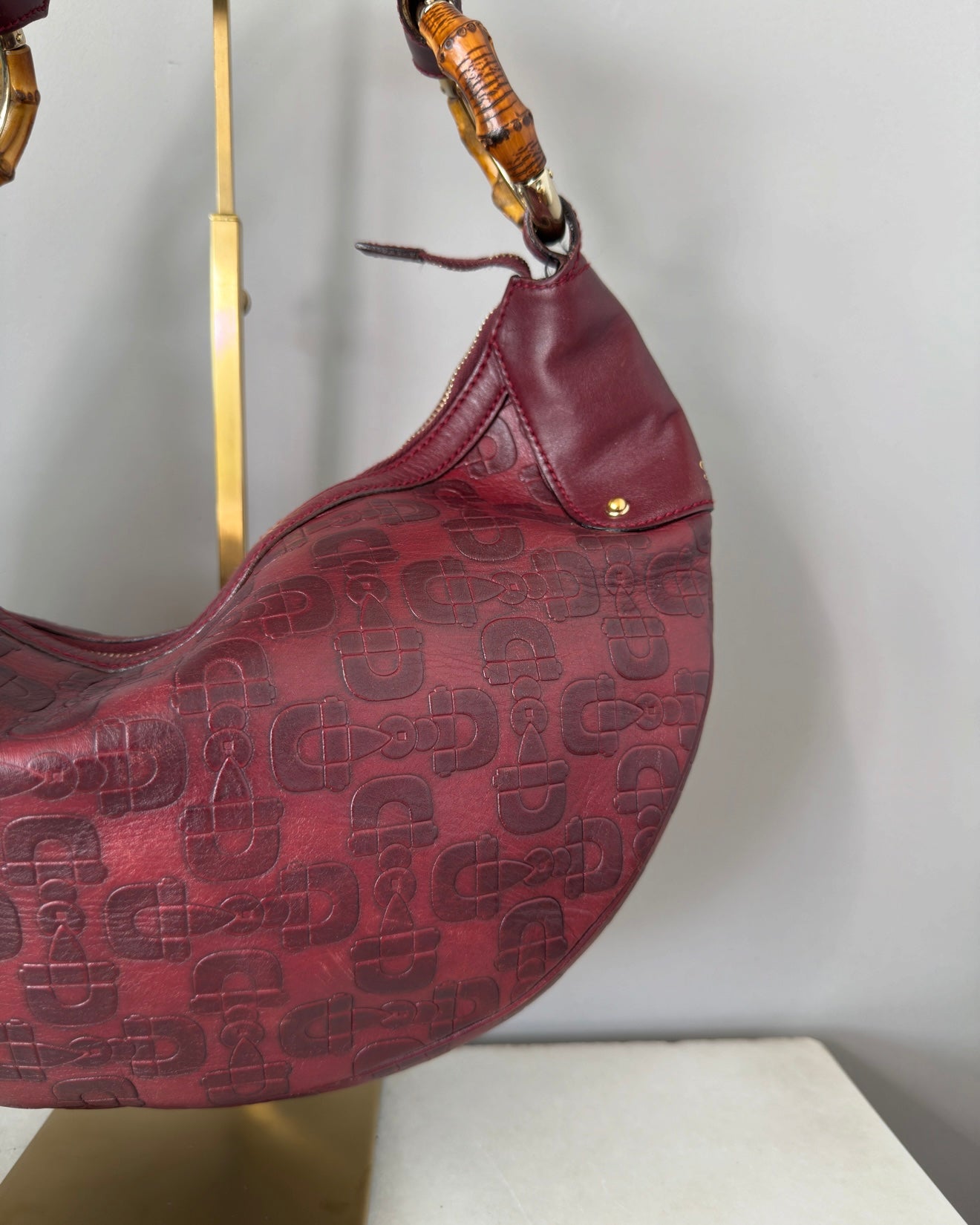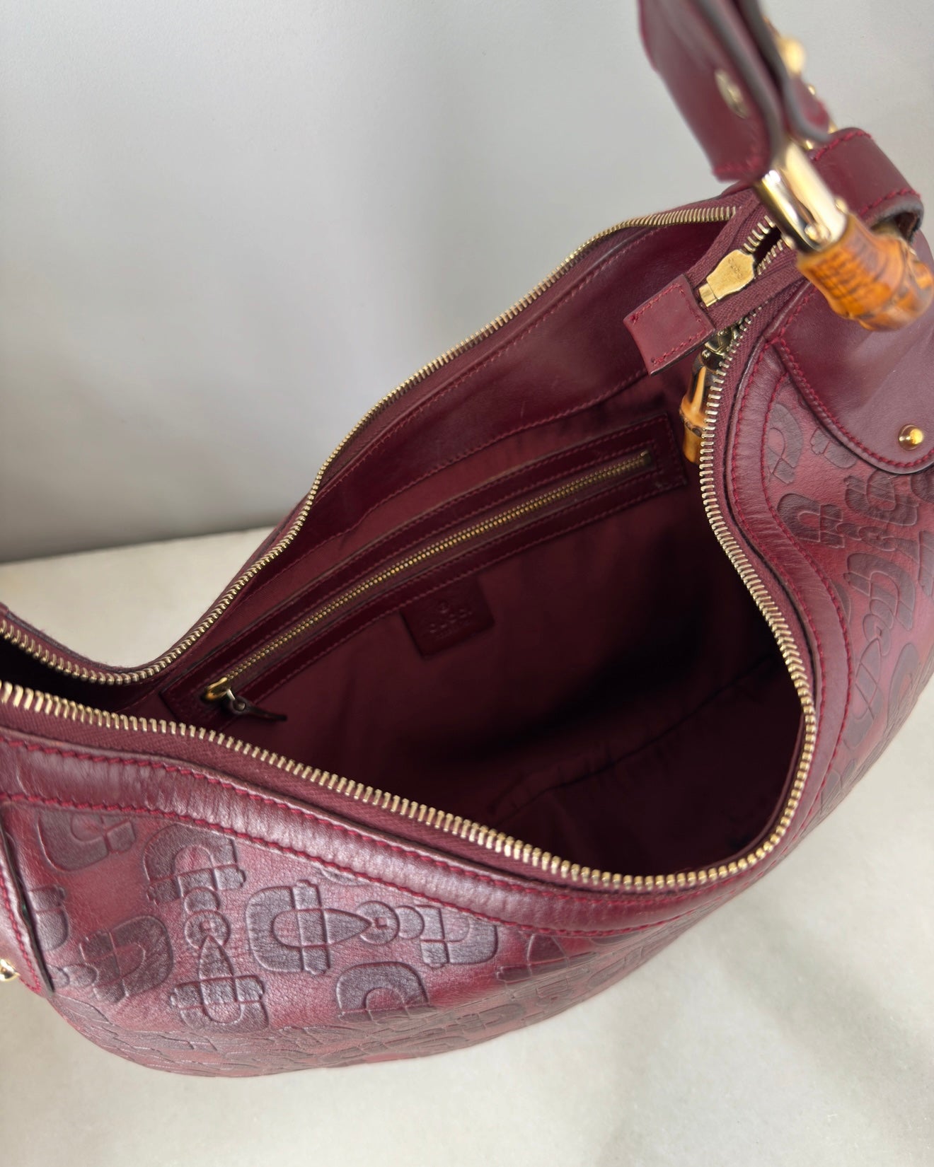 Bolso de hombro vintage de la firma italiana Gucci. El exterior se encuentra confeccionado en piel con estampados ecuestres y piezas metálicas refinadas. El interior se encuentra confeccionado en forro de tela. Su diseño incluye cierre de cremallera y un bolsillo interior con cierre de cremallera.