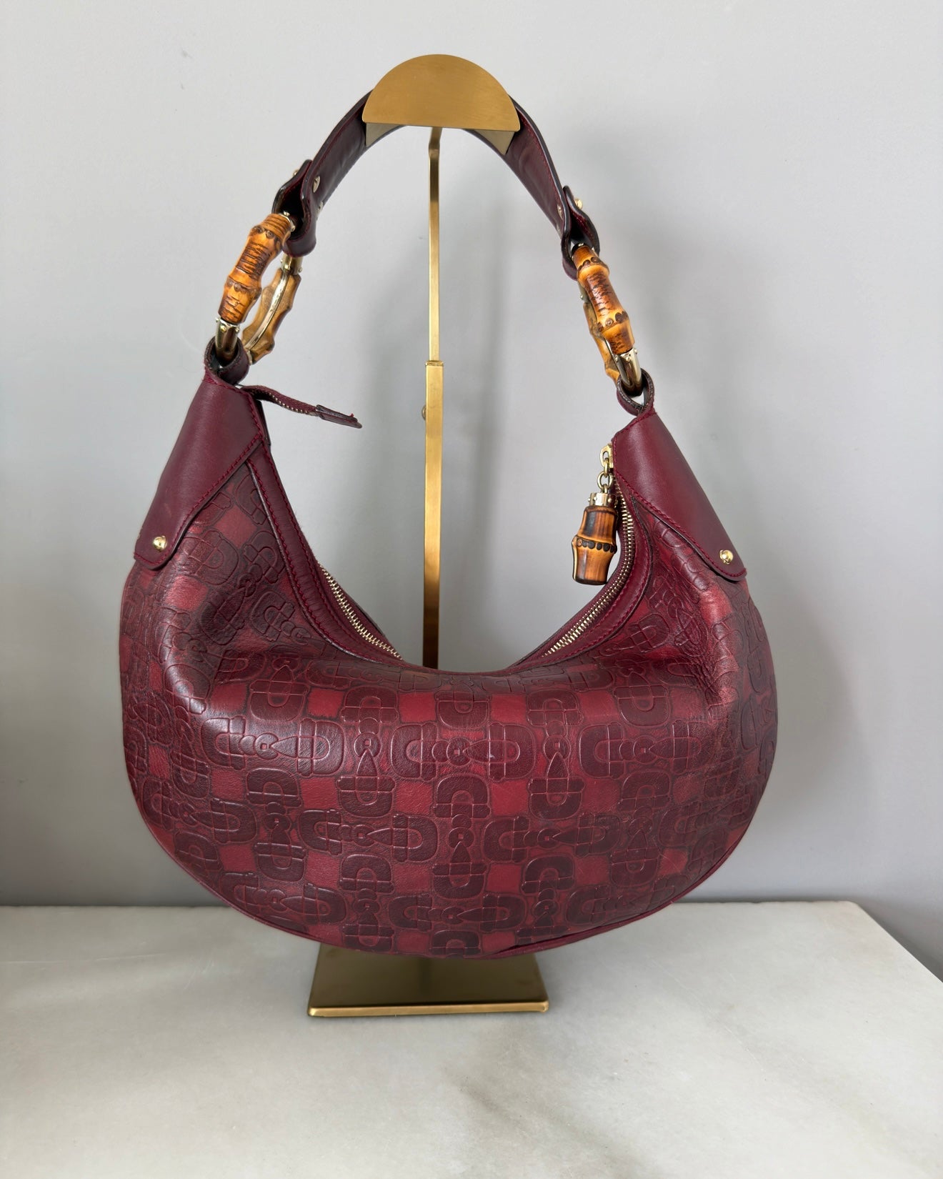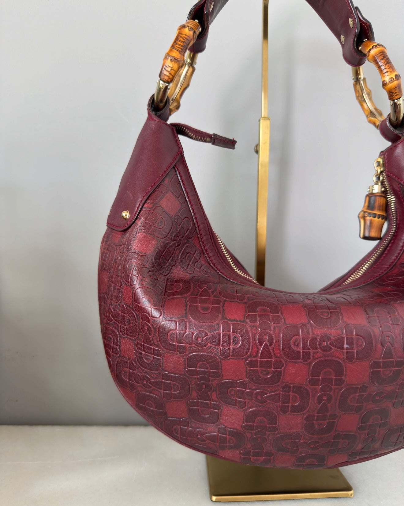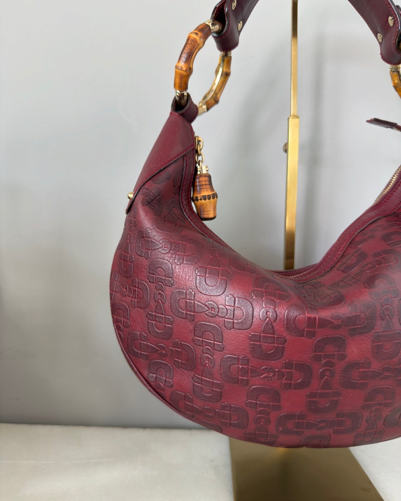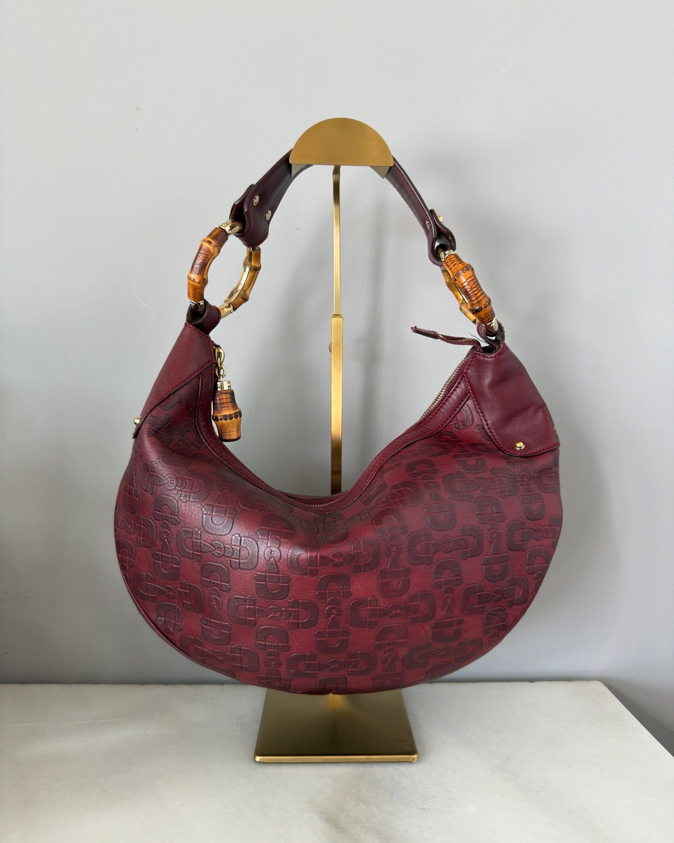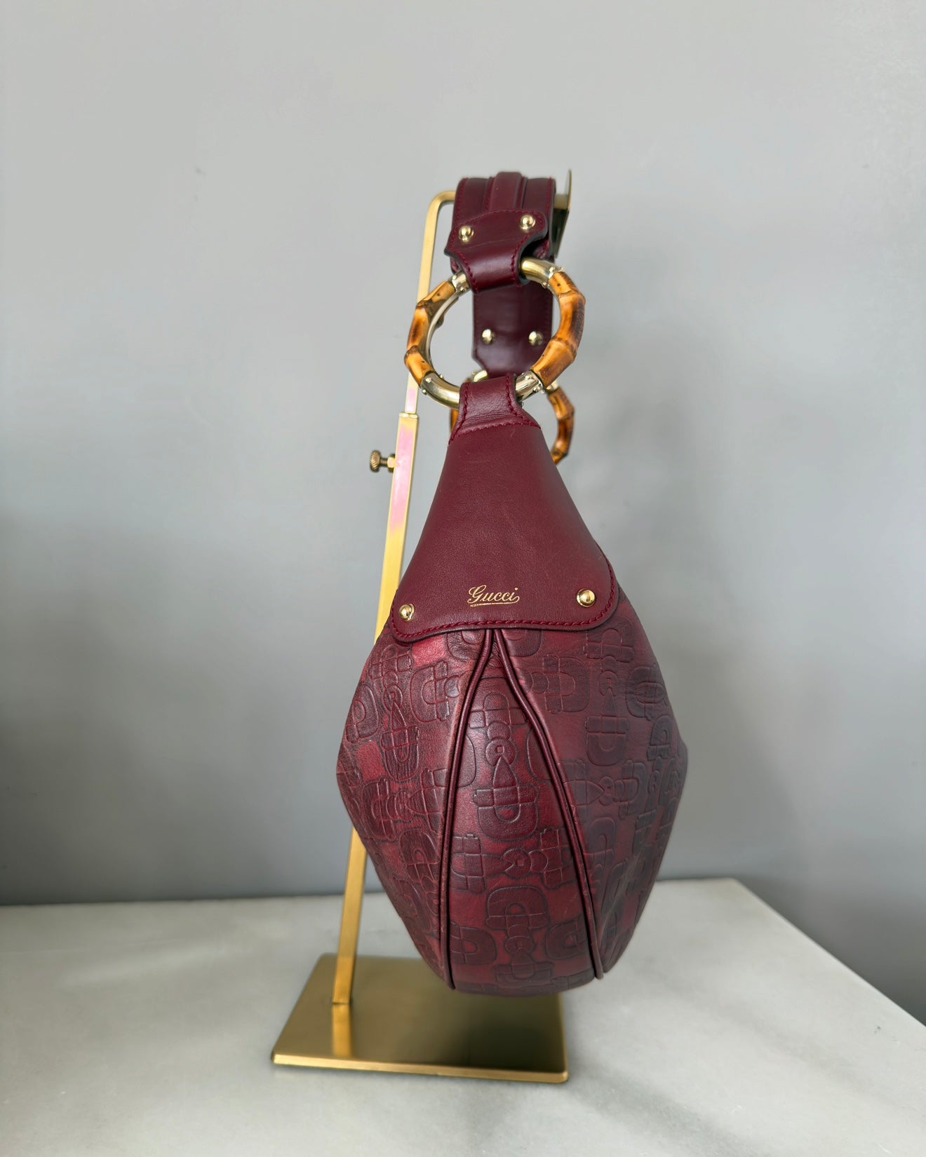 Bolso de hombro vintage de la firma italiana Gucci. El exterior se encuentra confeccionado en piel con estampados ecuestres y piezas metálicas refinadas. El interior se encuentra confeccionado en forro de tela. Su diseño incluye cierre de cremallera y un bolsillo interior con cierre de cremallera.